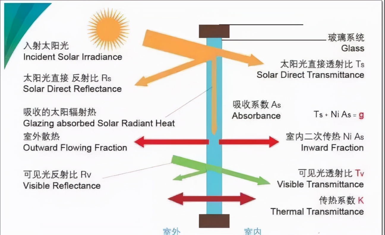 温差传热主要通过降低玻璃的传热系数K来控制,太阳辐射传热主要通过调节太阳能总透射比g和红外热能总透射比gIR来加以控制。