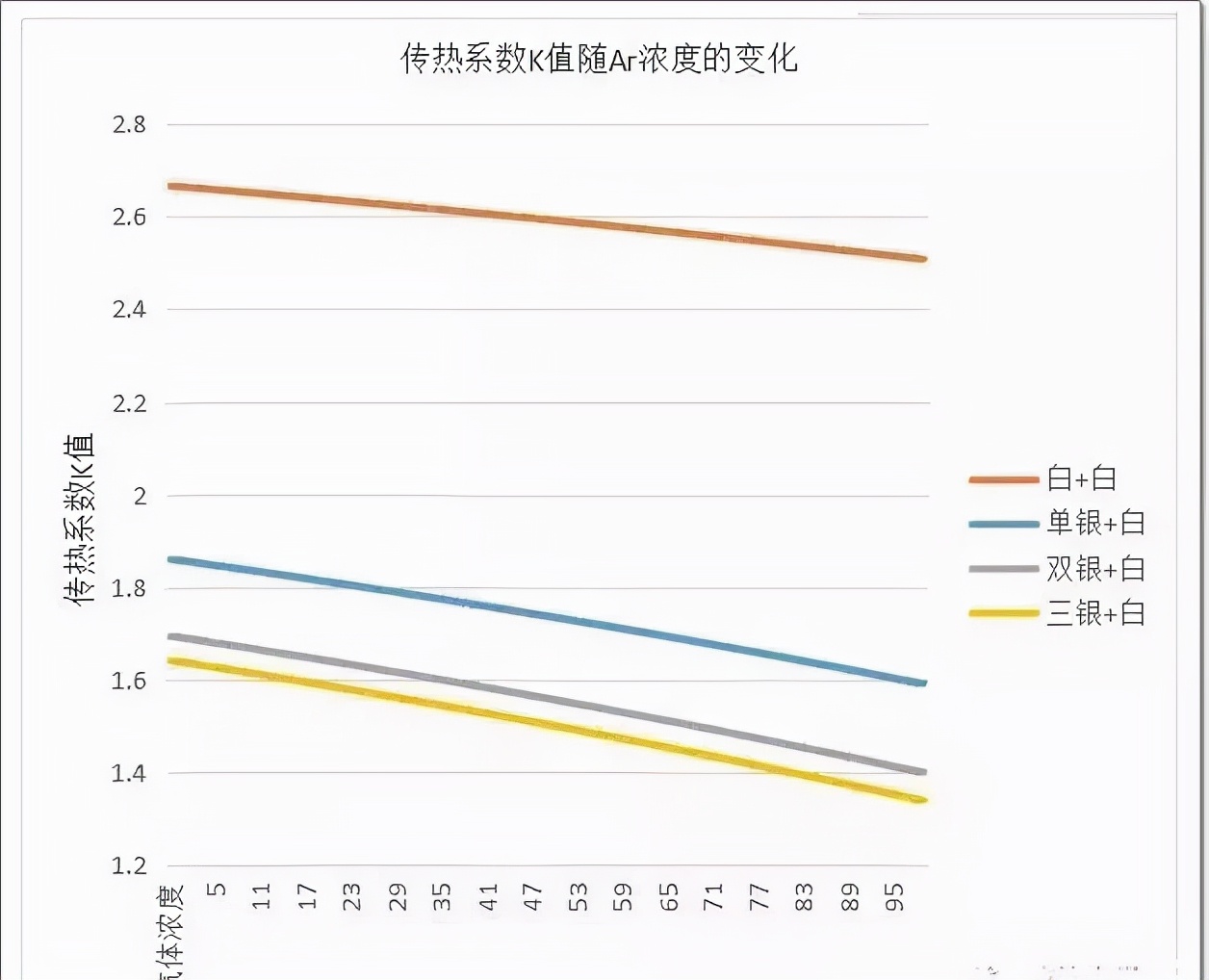由图3可见,无论是我们分析的那种玻璃,随氩气含量的增加,其传热系数显著降低。以单银+白玻为例,氩气含量从0-100%,传热系数从1.86下降到1.59;三银+白玻,传热系数从1.64下降到1.34。