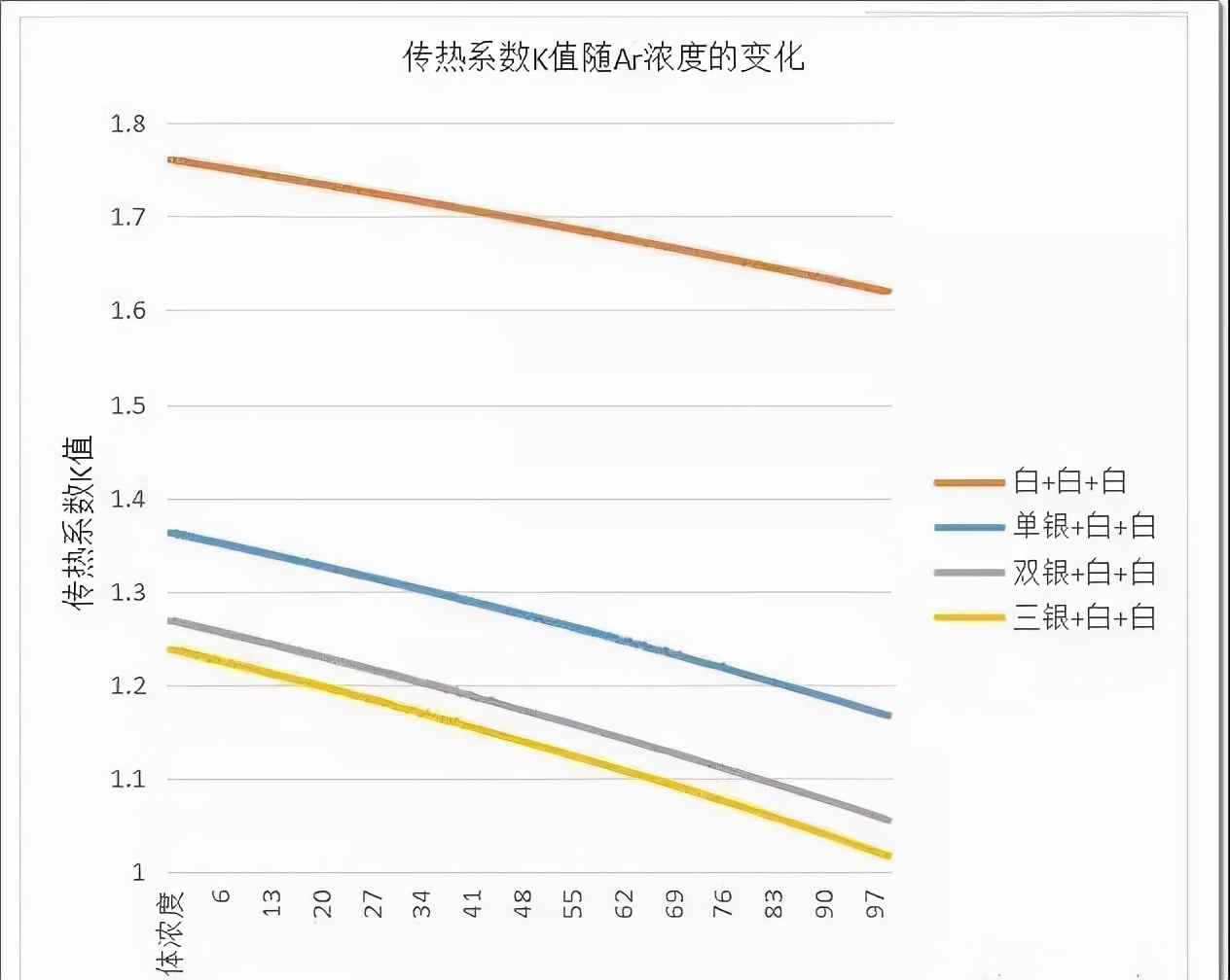 由图4可见,随氩气含量的增加,其传热系数显著降低。以单银+白玻+白玻为例,氩气含量从0-100%,传热系数从1.36下降到1.17;三银+白玻+白玻,传热系数从1.24下降到1.02。